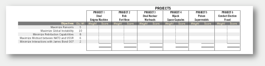 A more structured approach involves scoring projects against multiple criteria. Independent of the individual projects (and their managers or sponsors), leadership should identify the key measures of strategic success. Think in terms of production, finance, marketing, and risk (For example, “Maximize market share”, “Maximize revenue”, “Minimize product cannibalization”, “Minimize business risk”), but do not worry about minimizing constraints at this point (such as whether there are enough database engineers or brand analysts to do the job).