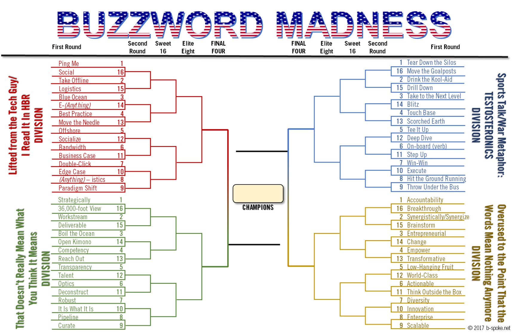 Faffing About, Managing People March Madness! Annoying Buzzword Edition Complete your brackets and follow along for all the fun! Click to Enlarge/Print. Please, no wagering. Share this: Click to share on X (Opens in new window) X Click to share on Facebook (Opens in new window) Facebook Like Loading... Related
