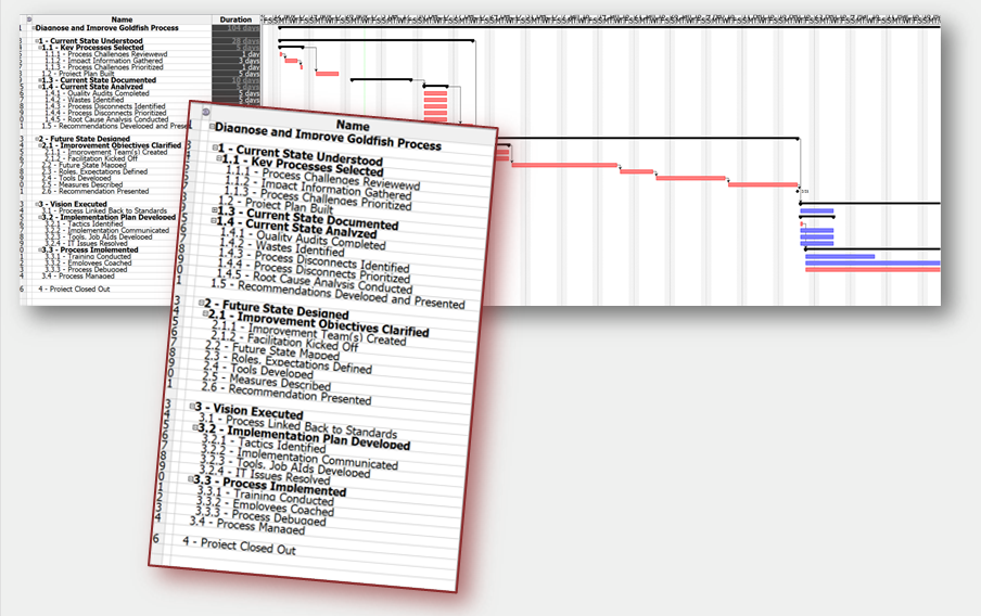 akage, predicting the effort to fix it is tough. The improvement manager, though, can structure a plan with three major deliverables (hint: they correspond with the three phases of the model) including a fairly-accurate straw man for Phase 2. Phase 3 – “Execute” – will be vague, as the decisions that impact its scope aren’t even known. That said, it is critical to lay out the plan now, to make visible to all stakeholders what will be required (in terms of effort and resources) to achieve the organization’s goals.